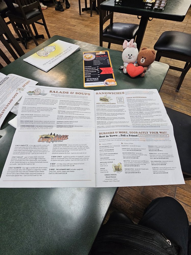 A four egg omelette cooked with onions and Cincy Chili inside, folded then topped with more chili and Cheddar Jack cheese and served with Habla Diablo seasoned potatoes, and choice of toast or homemade banana nut muffin. Substitute potatoes for fruit 2.25